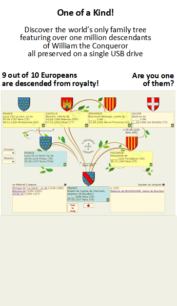 Nine out of ten European are descendants of Charlemagne, probably a little fewer are descendants of William the Conqueror! This purely statistical statement is confirmed every day by introducing new lists of descendants of various social backgrounds.
